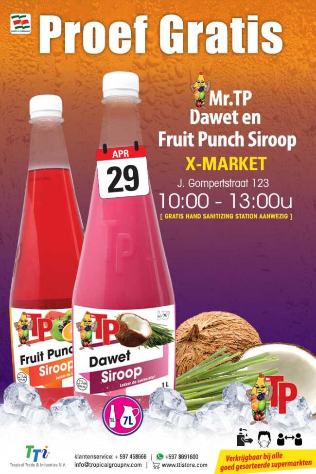 Proef Gratis Mr.TP Dawet en Fruit Punch Siroop op donderdag 29 april 2021 bij X-Market aan de J. Gompertstraat 123 van 10:00u – 13:00u.