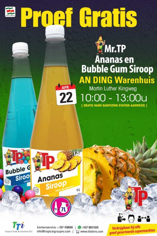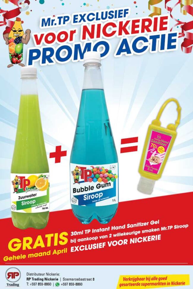 Mr.TP Promo ActieExclusief voor Nickerie. Gehele maand AprilGRATIS 30ml TP Instant Hand Saniktizer Gel bij aankoop van 2 willekeurige Mr.TP stropen. Verkrijgbaar bij alle goed gesorteerde supermarkten. Meer informatie nodig?RP Trading Nickerie aan de Soemaroebastraat 8 of bellen / appen naar +597 859-8860